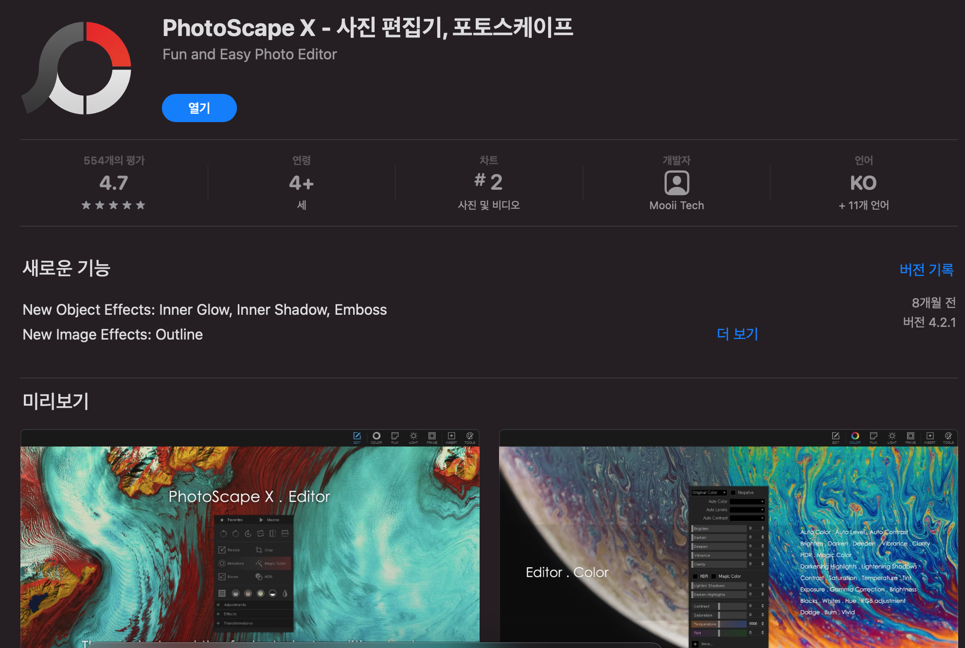 앱스토어에서 PhotoScape X를 검색하면 아래와 같이 나타납니다. 무료 앱이니 다운로드해주시면 됩니다!