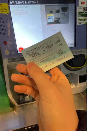 3. 입국 일어날 발권한 왕복할인권 돌아가는 승차권을 기계에 투입.
