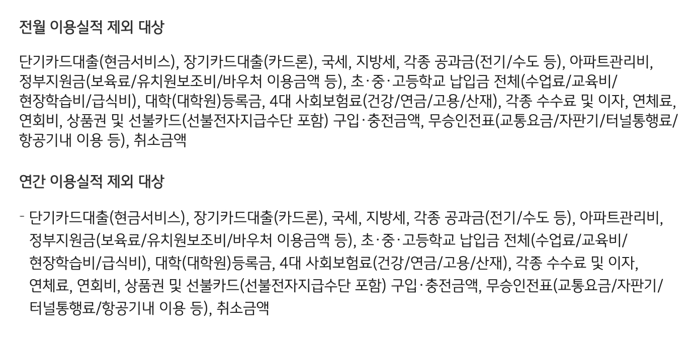 전월 실적 제외 대상 결제건은 아래와 같습니다. 상품권 상테크는 불가한 카드!